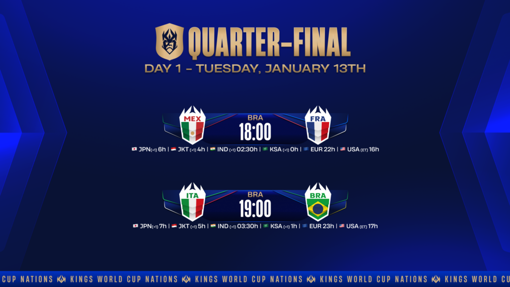 تستمر بطولة Kings World Cup Nations 2026 في Trident Arena بمدينة ساو باولو. بعد نهاية يوم جولة Last Chance وإجراء قرعة مواجهات ربع النهائي، إليكم مواعيد الأيام القادمة حيث ستقدم الفرق كل ما لديها للتأهل إلى نصف النهائي.
