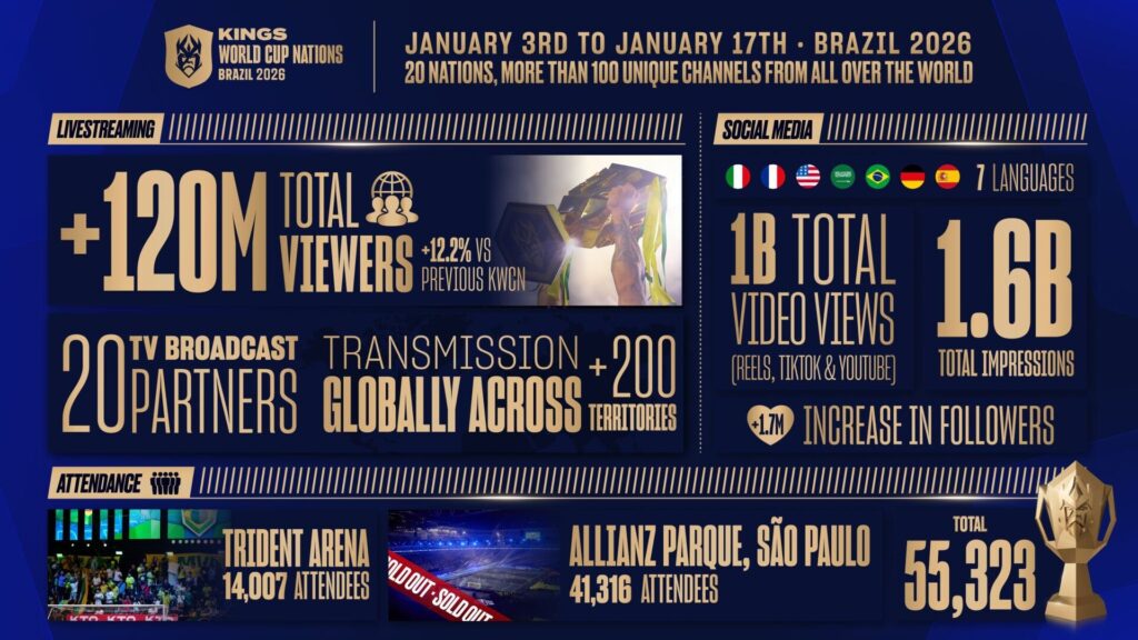 Die Zahlen sprechen für sich. Die Kings World Cup Nations 2026 erreichte 120 Millionen kumulierte Live-Zuschauer, mit Übertragungen in mehr als 200 Territorien weltweit.