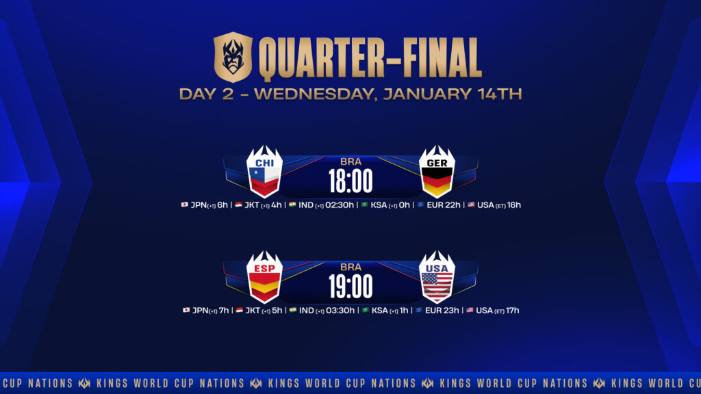Die Kings World Cup Nations 2026 wird in der Trident Arena in São Paulo fortgesetzt. Nach der Last-Chance-Runde und der Auslosung der Viertelfinal-Paarungen stehen die Termine nun fest. Hier sind die Anstoßzeiten für die kommenden Tage, an denen die Teams alles geben werden, um den Einzug ins Halbfinale zu perfektionieren.