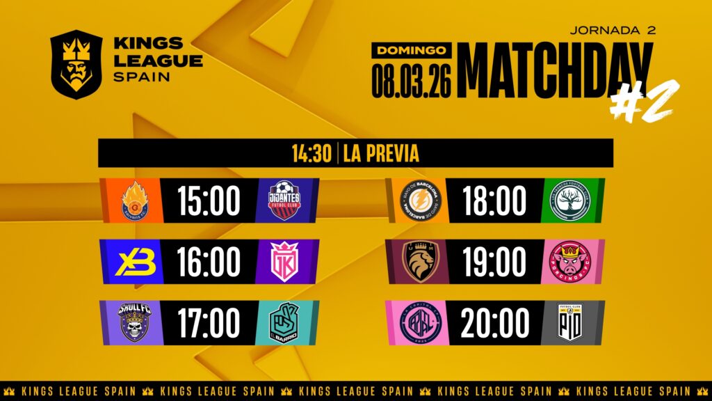 La Kings League Spain vuelve el domingo 8 de marzo con una Jornada 2 diseñada para mover la tabla desde temprano: xBuyer Team quiere confirmar que su inicio no fue casualidad, Ultimate Móstoles defiende su dominio tras el 7-0 del estreno y La Capital y PIO protagonizan un cierre con sabor a partidazo.