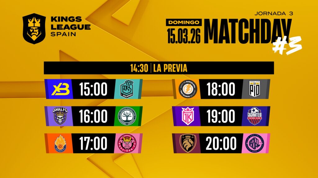 La Kings League Spain vuelve el domingo 15 de marzo con una Jornada 3 que puede empezar a marcar las primeras dinámicas del Split 6. La Capital CF llega obligada a reaccionar tras caer ante PIO, mientras Ultimate Móstoles defiende el liderato y equipos como xBuyer Team o Rayo de Barcelona intentan mantenerse en la zona alta.