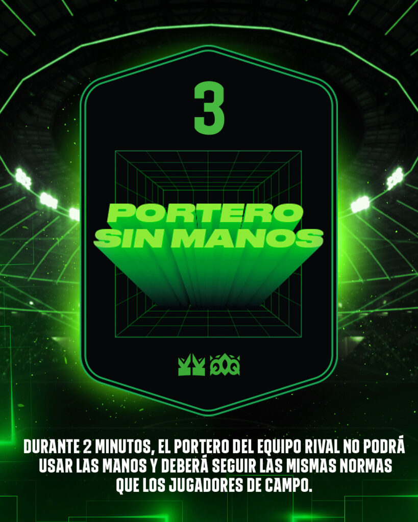 Dos minutos eternos para el rival. El portero no podrá usar las manos y tendrá que jugar como si fuera un jugador de campo más. Cada tiro, cada centro, cada rebote… se convierte en una amenaza mortal. Una carta para desatar el pánico y para que la grada grite con cada disparo.