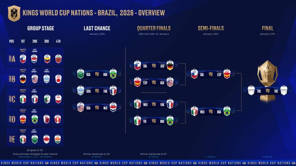 La Kings World Cup Nations 2026 llega a su punto álgido con las semifinales en el Trident Arena de São Paulo. Chile y España se enfrentan en un duelo de invictos, mientras que México se mide ante el anfitrión y vigente campeón, Brasil. Estos encuentros decisivos del 15 de enero determinarán quiénes avanzan a la gran final en el Allianz Parque el 17 de enero.