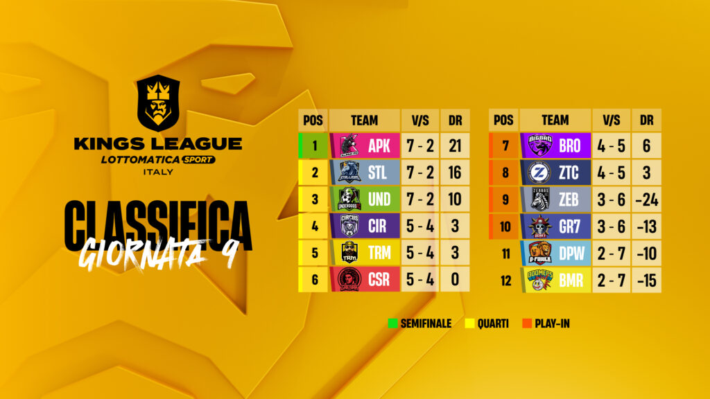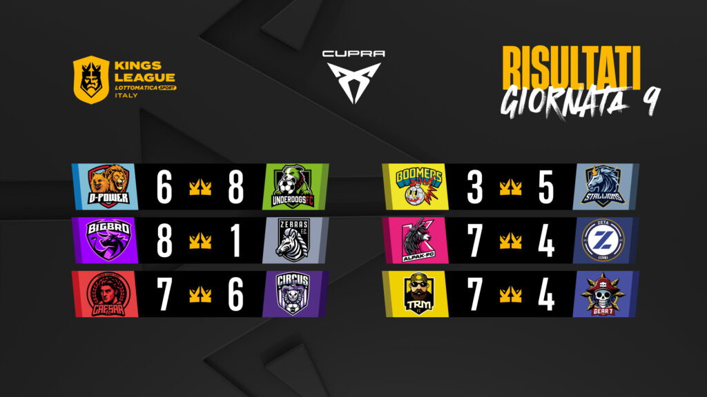 Alpak, Stallions e Underdogs ottengono la qualificazione matematica ai quarti di finale con due turni di anticipo. La Giornata 9 si chiude con lo scontro tra le leggende Dida e Abbiati e la risalita dei BIGBRO.