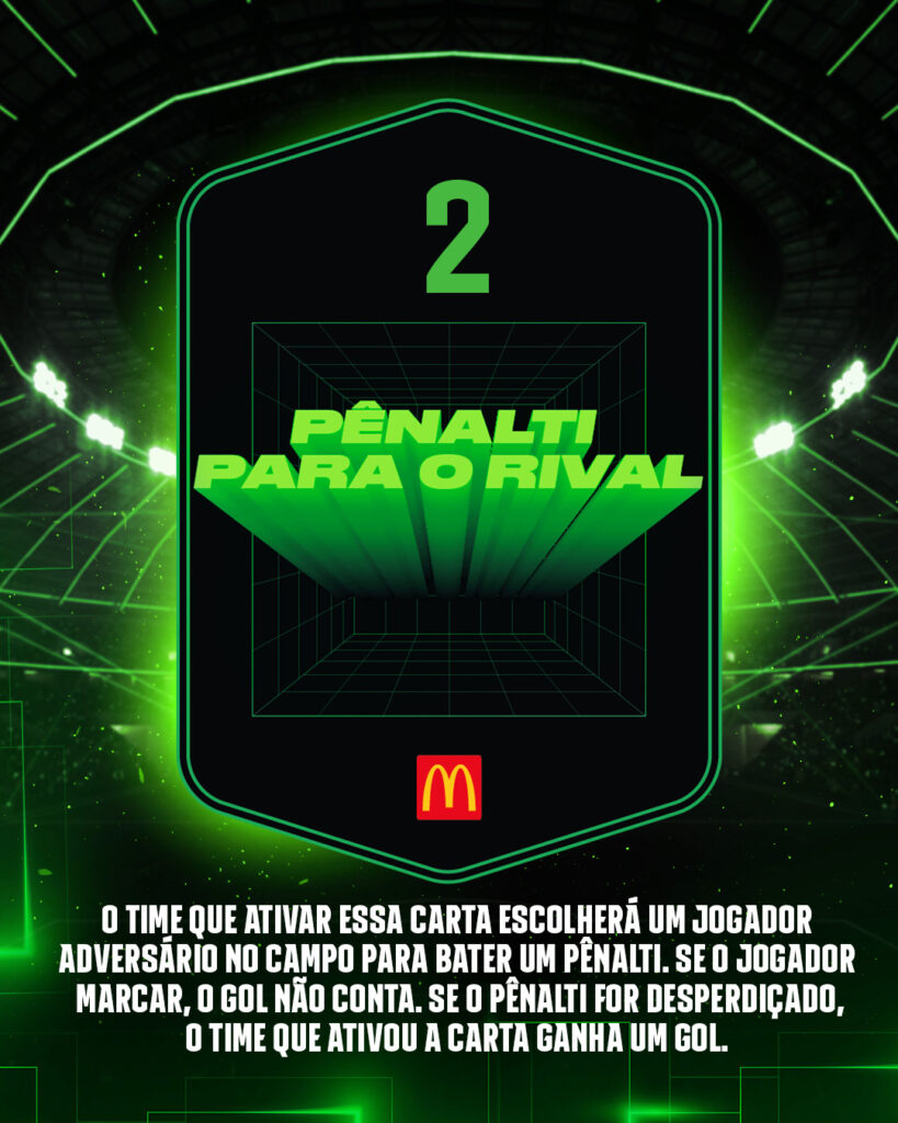 Se ele marcar, o gol não vale. Mas se ele perder… o time que jogou a carta ganha um gol automático! Pressão, nervos, vingança. Usar bem pode quebrar o psicológico do rival.