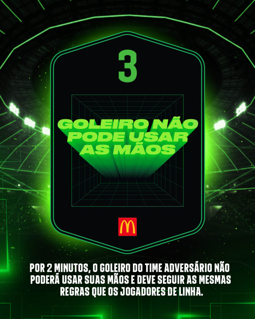 Dois minutos eternos para o adversário. O goleiro não pode usar as mãos e tem que jogar como se fosse de linha. Cada chute, cada cruzamento, cada rebote vira uma ameaça mortal. Uma carta para soltar o caos e fazer a torcida gritar a cada bola.
