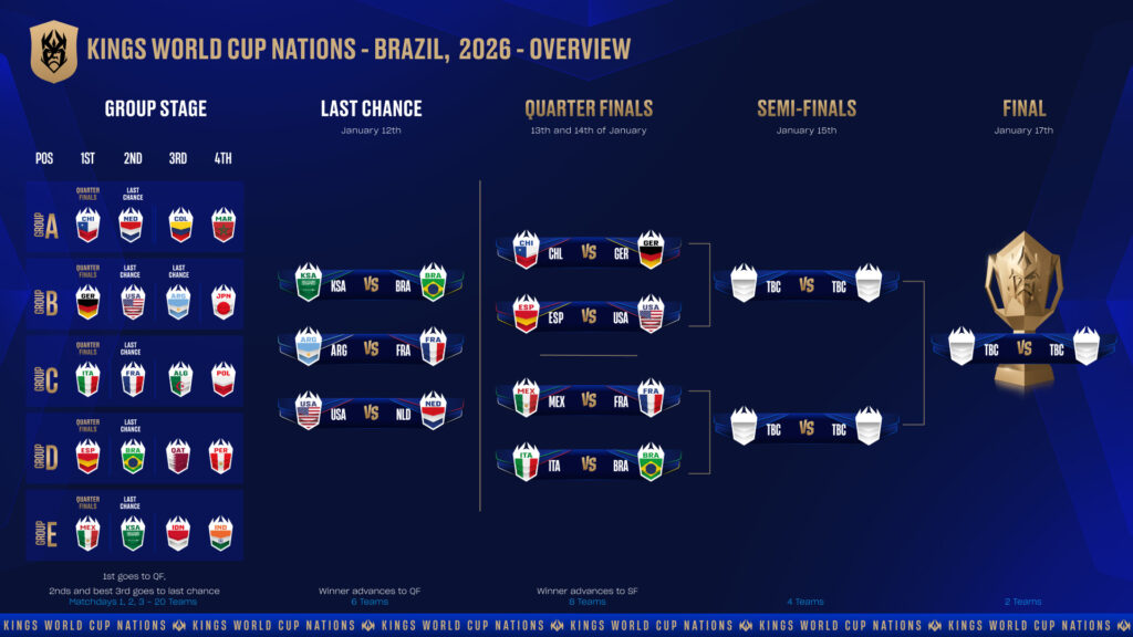 A Kings World Cup Nations 2026 continua na Trident Arena, em São Paulo. Após a rodada do Last Chance, que terminou com a definição dos confrontos das quartas de final, confira os horários dos próximos dias, onde as equipes darão tudo de si para chegar à semifinal.