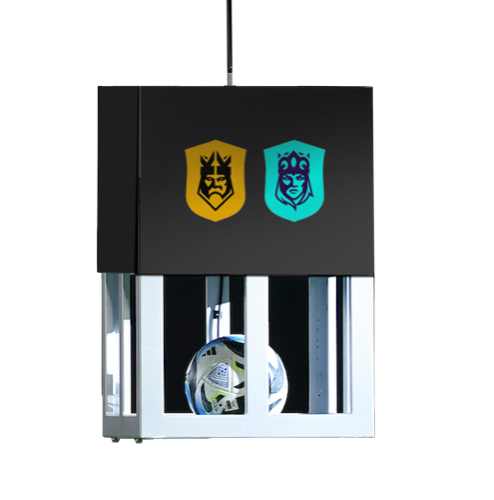 O segundo tempo começa com o lançamento de um dado gigante com 3 lados duplicados. Se sair o logo da Kings League, é 1 vs 1 (um jogador de linha + goleiros). Se sair 2, é 2 vs 2. Se sair 3, é 3 vs 3.